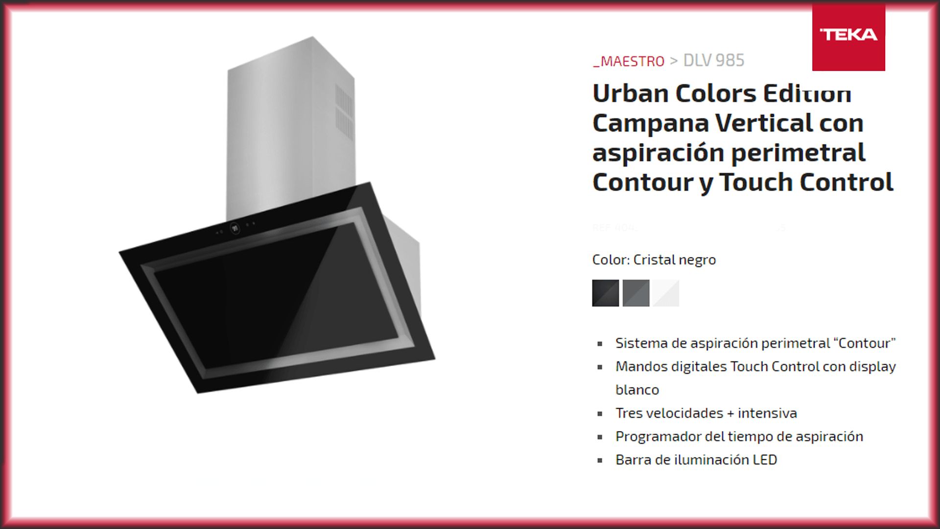 Dentro de la gama Maestro tenemos el modelo Quadro DLV 985, una campana vertical de CristalColor. Disponible en cristal negro y blanco.