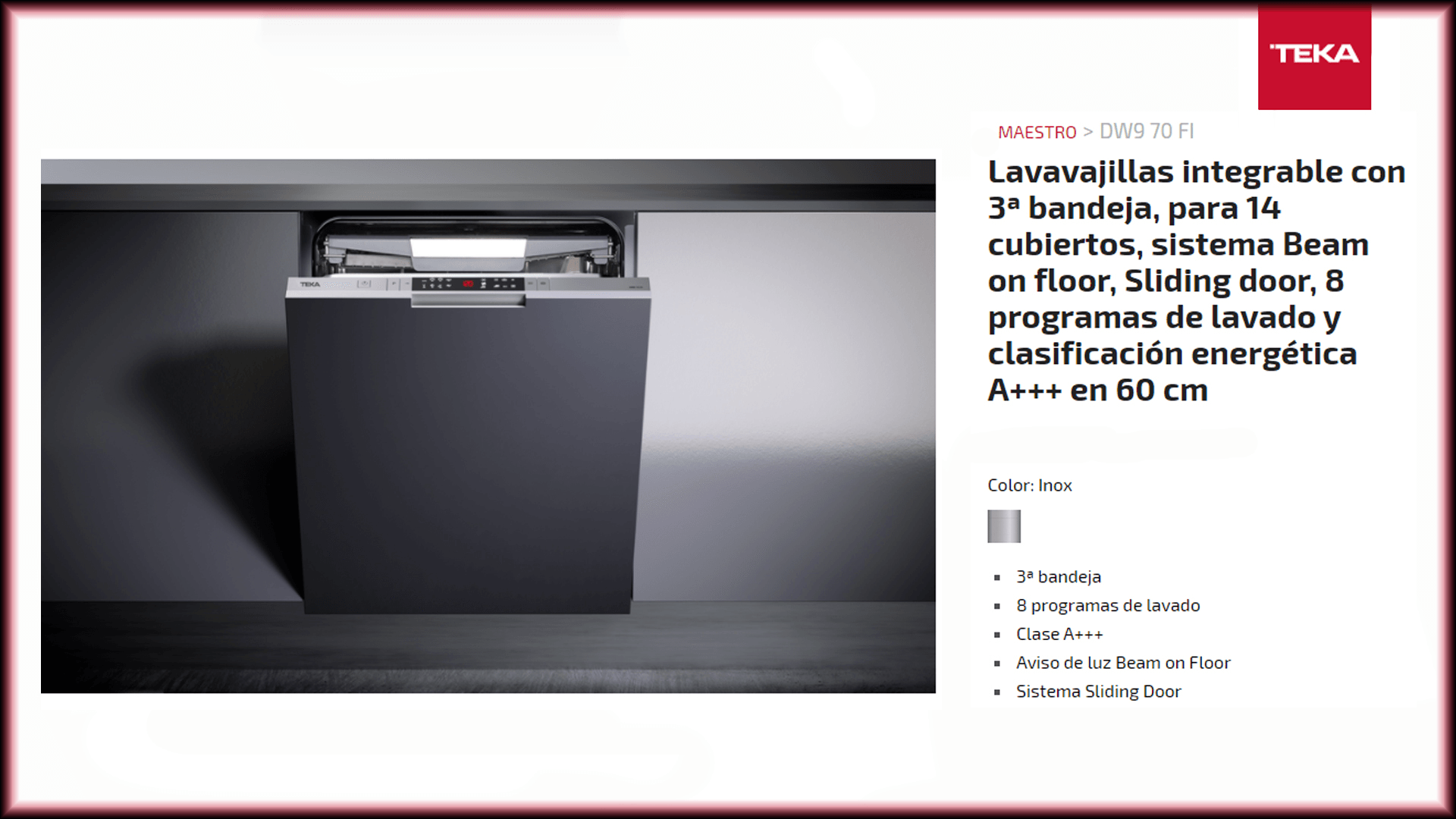Este lavavajillas, de la gama Maestro, cuyo modelo es DW9 70 FI, de acero inoxidable. Tiene una capacidad de 14 cubiertos, gracias a su tercera bandeja. La cesta superior es regulable en altura.
