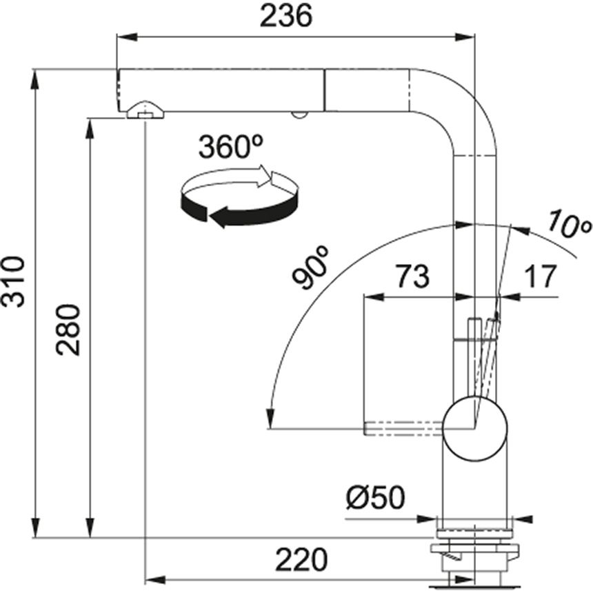 Su altura total es de 425 mm, cayendo el agua a una altura de 280 mm. En cuanto a su rotación, igual al de los modelos anteriores, es de 360 grados.